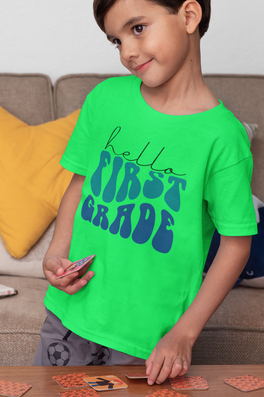 Hello First Grade Retro Blue | Youth and Adult T-Shirts