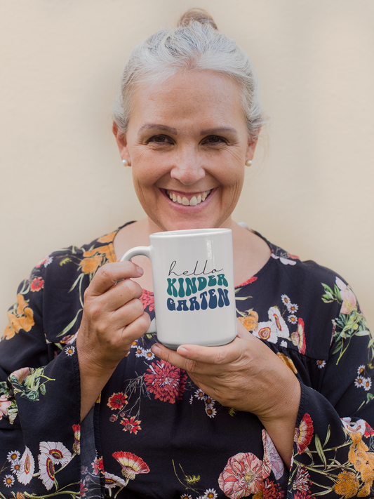 Hello Kindergarten Grade Retro Blue | 15 oz. White Mug
