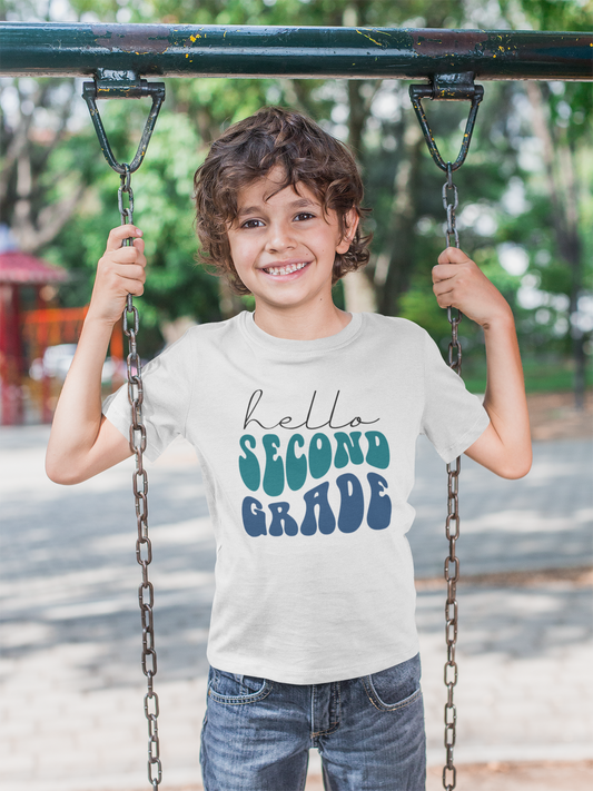 Hello Second Grade Retro Blue | Youth and Adult T-Shirts
