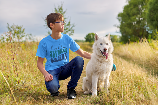 Hello Seventh Grade Retro Blue | Youth and Adult T-Shirts