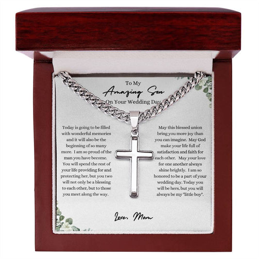 To My Amazing Son On Your Wedding Day | Personalized Steel Cross Necklace on Cuban Chain